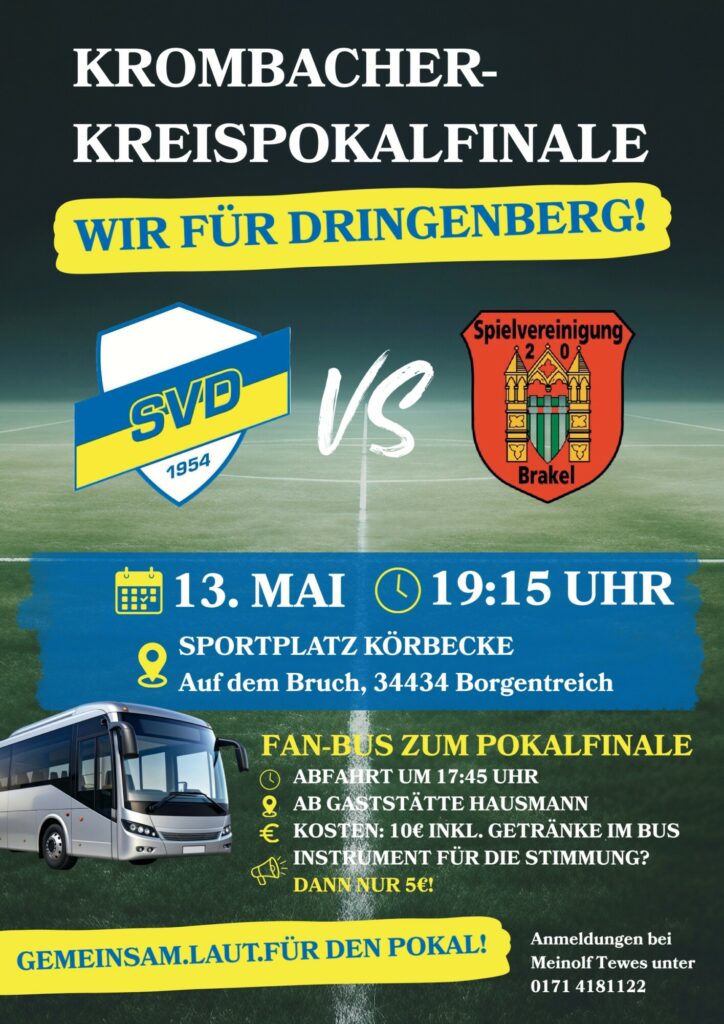 Der SVD steht im DFB-Kreispokalfinale. Am Mittwoch, 13.05. geht es ab 19.15Uhr in Körbecke gegen den Spvg. Brakel um den Titel. Um unsere Jungs zu unterstützten, setzt der Verein einen Fanbus ein. Dieser startet am Finaltag um 17:45 ab der Gaststätte Hausmann. Im Fahrpreis von 10 Euro sind alle Getränke enthalten. Jeder der ein „Instrument“ mitbringt um Stimmung zu machen, zahlt sogar nur 5 Euro.