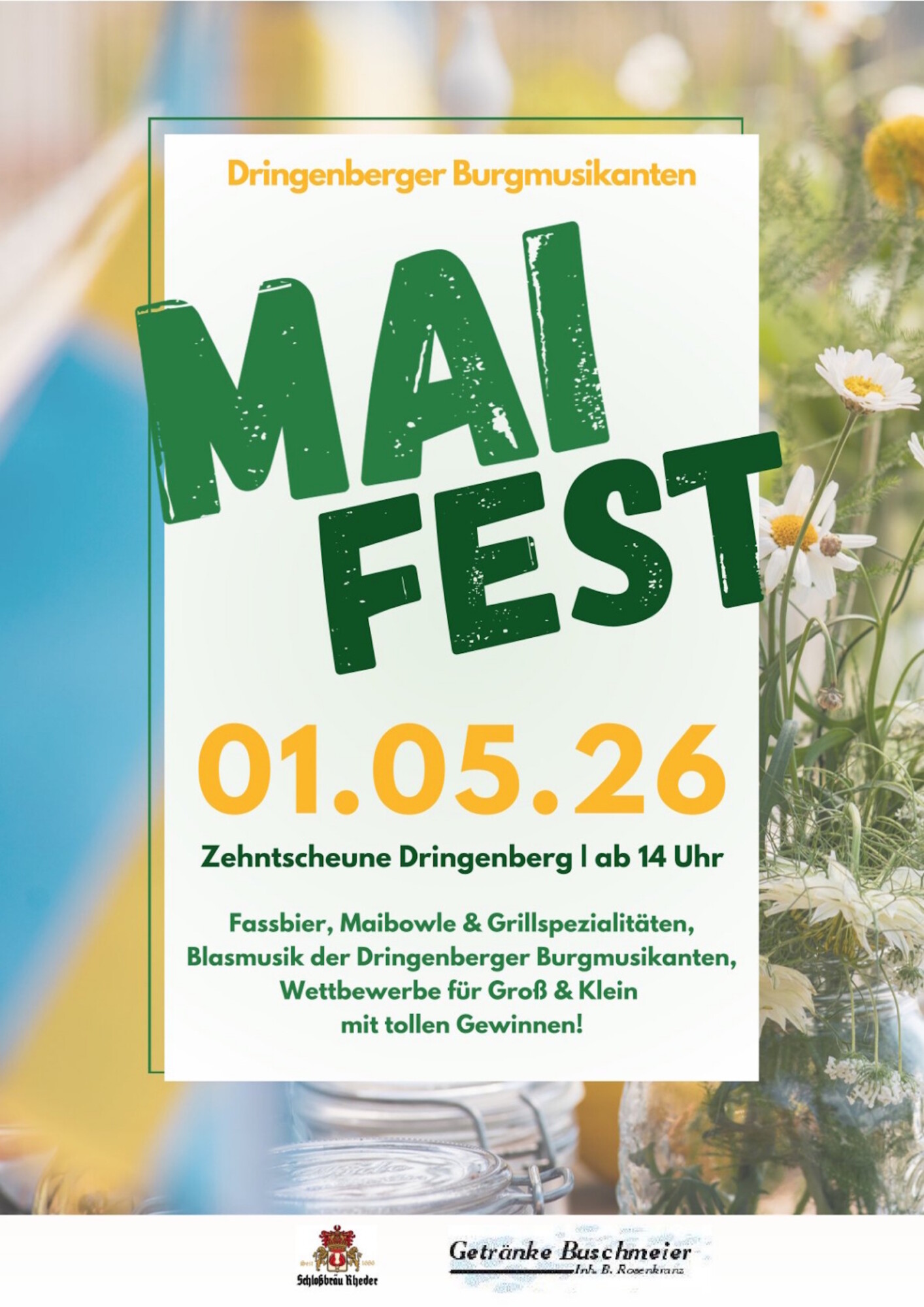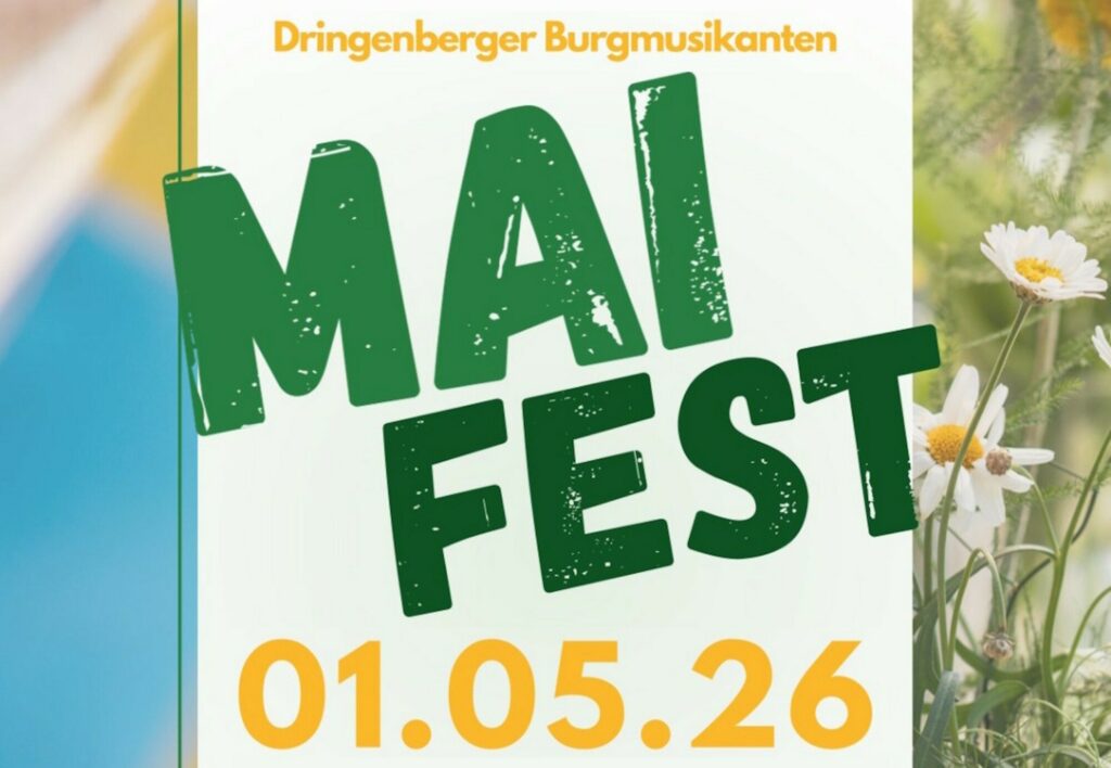 Wir, die Dringenberger Burgmusikanten, laden euch am 1. Mai 2026 herzlich zu unserem Maifest an der Zehntscheune in Dringenberg ein. Ab 14 Uhr erwartet euch ein gemütlicher Nachmittag mit Fassbier, erfrischender Maibowle und leckeren Grillspezialitäten.