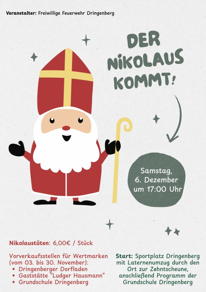 Am Nikolaustag, Samstag, dem 6. Dezember 2025, holen wir ihn um 17:00 Uhr am Sportplatz in Dringenberg ab und begleiten ihn im stimmungsvollen Laternenumzug zur Zehntscheune.