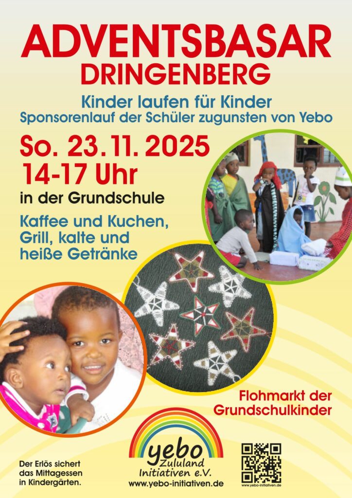 Der Adventsbasar öffnet wieder seine Tore in der Dringenberger Grundschule am Sonntag, dem 23. November 2025 von 14:00 bis 17:00 Uhr. Der Erlös geht an die Yebo Zululand Initiativen zur Finanzierung der Mahlzeiten in zwei Kindergärten in KwaZulu-Natal in Südafrika – für die Kinder oftmals die einzige warme Mahlzeit des Tages.